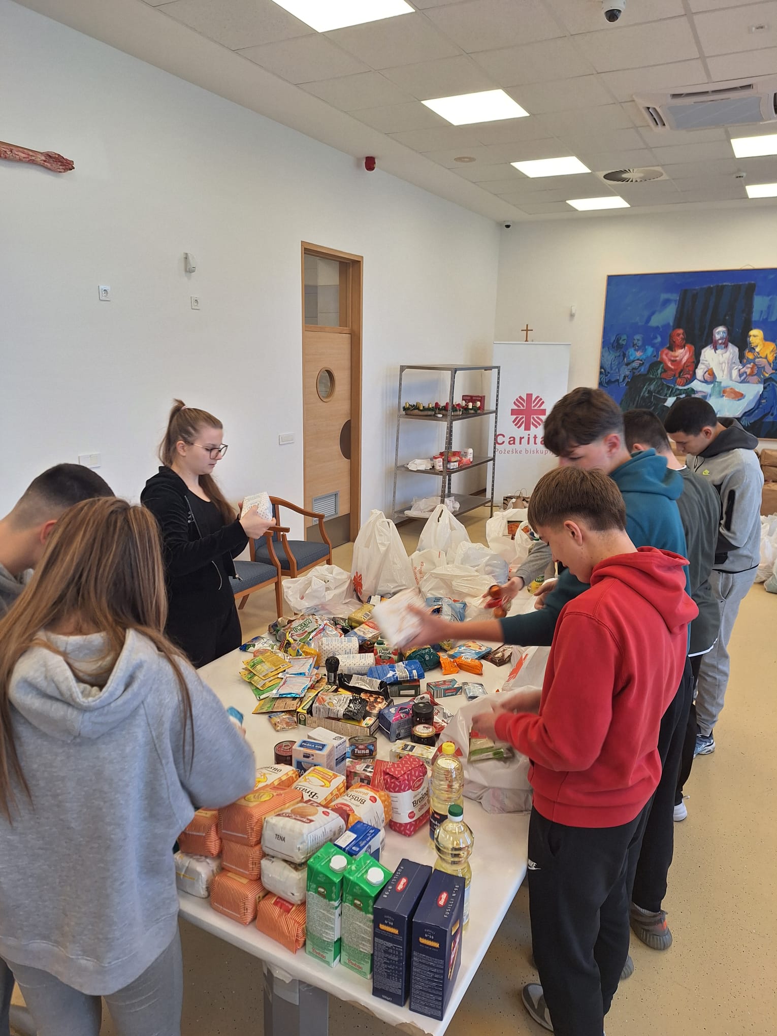 Učenici predvođeni razrednicama Marijom Tonković i Ivanom Budić bili su podijeljeni u 4 ekipe na 4 različita volonterska “punkta”: ispomoć u kuhinji, organizacija Riznice dobrote i skladišta, dostava paketa krajnjim korisnicima i sortiranje novca za projekt Spasi kunu od propasti.