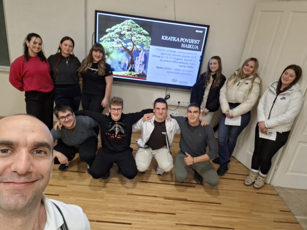 U ugodnoj atmosferi uz kavu i čaj učenike je voditelj radionice prof. Miroslav Paulić najprije upoznao s poviješću, strukturom i tehnikama pisanja haikua, a potom su učenici sami pokušali napisati neki svoje prve, a neki svoje druge i treće haikue. ⛩️️