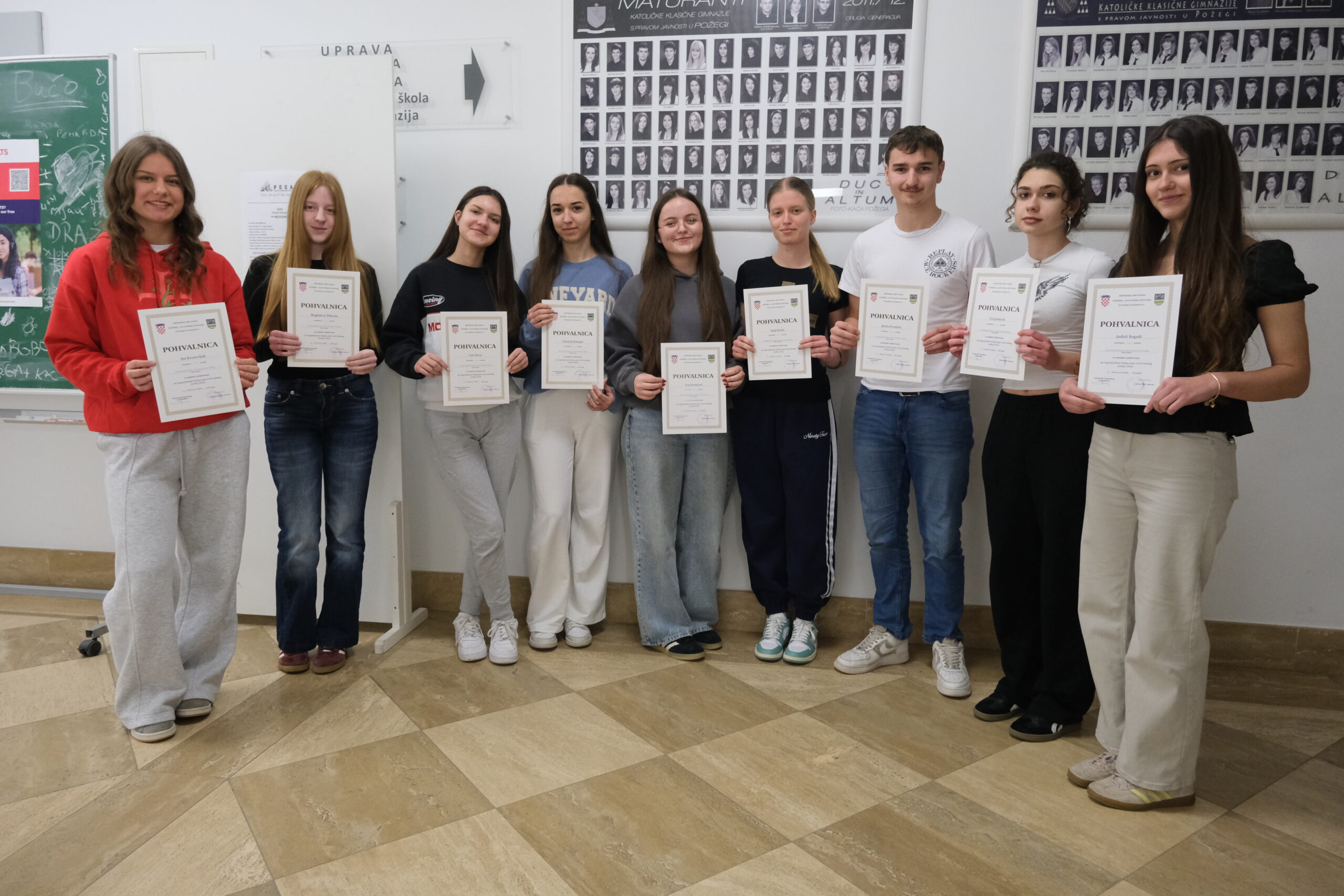 Ove godine Katoličku gimnaziju na Županijskom natjecanju iz Hrvatskoga jezika u Pakracu predstavljalo je 14 učenica i 2 učenika prof. Marijane Ćorluka i prof. Miroslava Paulića.