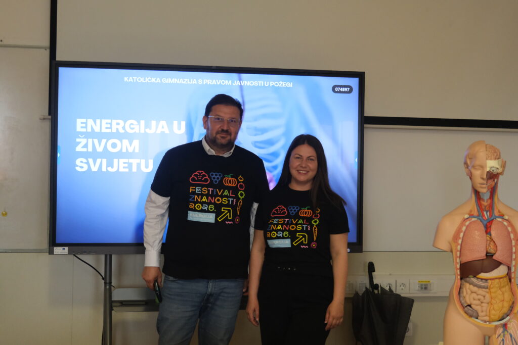 U sklopu Festivala znanosti u Katoličkoj gimnaziji održano je zanimljivo i edukativno predavanje pod nazivom „Energija u živom svijetu“, koje su organizirali prof. Martina Franjić i doc. dr. sc. Dalibor Divković s Medicinskog fakulteta u Osijeku. Predavanje je bilo usmjereno na razumijevanje uloge probavnog sustava u dobivanju energije, pravilnu prehranu te načine mjerenja unosa i potrošnje kalorija u svakodnevnom životu.